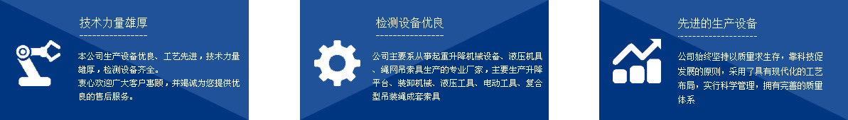 本公司系從事起重升降機械設備、液壓機具、繩網吊索具生產的專業廠家,主要生產千斤頂、液壓拉馬、軸承加熱器、升降平臺、裝卸機械、液壓工具、電動工具、復合型吊裝繩成套索具、高強纖維柔性吊裝帶、起重鏈條成套索具、橫梁吊具、注塑繩、軟梯、安全帶、安全網等幾大系列、上百種規格的產品,廣泛應用于電力、油田、大型鋼廠、機電、化工、航空、冶金、機械、鐵道、造紙、港口、建筑等領域。